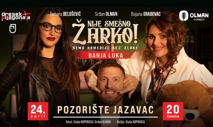 Komedija “Nije smešno, Žarko”, u kojoj igraju Srđan Olman, Tamara Belošević i Bojana Grabovac, biće izvedena u petak, 24. aprila sa početkom u 20 časova u Gradskom pozorištu “Jazavac”.
