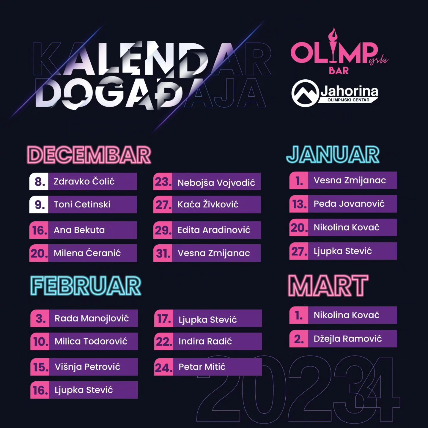 Već od 9. decembra, zabava se seli na 1.879 metara nadmorske visine, u udobni ambijent Olimp bara, gdje će se održati koncert Tonija Cetinjskog, ali i svi ostali nastupi iz uzbudljivog kalendara događaja.