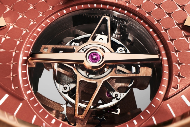 U srcu ovog modela kuca legendarni El Primero 3630 – automatski mehanizam visoke frekvencije od 5Hz (36.000 vibracija na sat). Turbijon težak svega 0,25 grama deluje gotovo nemoguće lagano, dok se kroz prozirni poklopac kućišta vidi zadivljujući prizor: trodimenzionalni, laserski graviran côtes de Genève uzorak koji se širi iz centra, u savršenoj harmoniji sa motivom zvezde na brojčaniku. Rotor u obliku otvorene zvezde, po prvi put izrađen od ružičastog zlata, otkriva ritmičnu dušu časovnika.