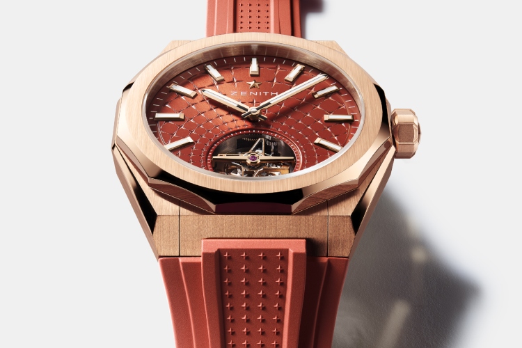 Završni detalj – integrisana narukvica od ružičastog zlata u H-stilu grli zglob sa istom lakoćom kojom privlači poglede. A za one koji vole promene, tu je i dodatni gumeni kaiš u boji cigle, koji se lako menja zahvaljujući Zenith sistemu brze zamene.